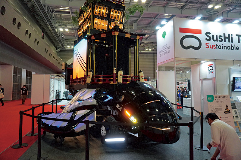 土台はまるで亀のようなフォルム。その上に、なんと神輿の山車がドッキング! 檜原産の杉の木を使ったサステナブルで本格的な造りで、見た目のインパクトは抜群でした。