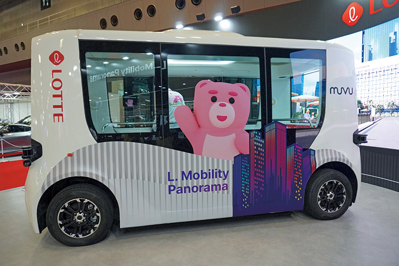 お菓子でおなじみのロッテが、自動運転シャトルを展示。スタッフさんによると「韓国から持ってきました!」とのこと。企業の新しい挑戦を間近で感じられるのも、モビショーの面白さですね。